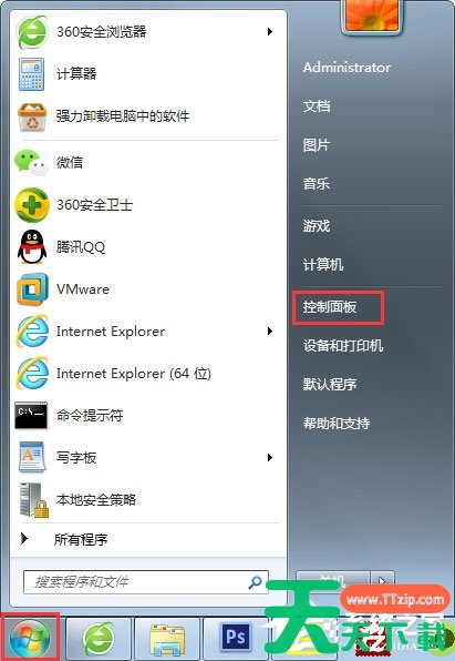 1、在开始菜单,看到“控制面板”选项,鼠标左键点击打开“控制面板”;
