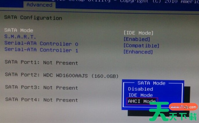 在看到蓝屏画面后将电脑进行重启,在看到开机画面是按下进入到bios设置中(台式机通用按DEL键,笔记本电脑按F1或者F2键),找到如下图所示的相关硬盘模式配置参数选项,将硬盘模式从IDE更改成为AHCI,接着保存更改设置,重新启动电脑后再次安装win7系统就不会再安装win7系统后出现电脑蓝屏的问题。