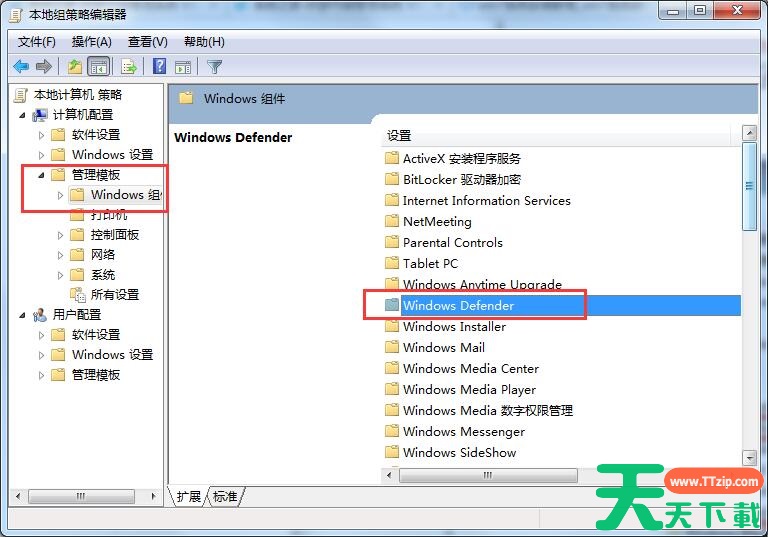 4、点击左侧“管理模板—》Windows组件”双击右侧 Windows Defender文件夹;