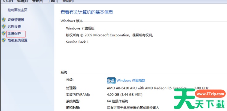 2、在计算机属性中,左上面找到【系统保护】,鼠标左键点击【系统保护】。