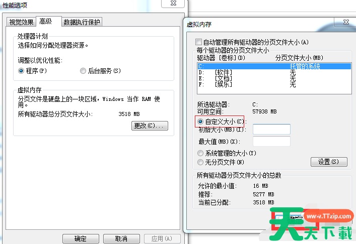 5、【高级】页面中有个【虚拟内存】,点击虚拟内存下方的【更改】,在【虚拟内存】页面,把【自动管理所有驱动器文件大小】的勾去掉,勾选下面【自定义大小】,然后自行设置内存大小,把原来的扩大一些,点击【确定】即可。