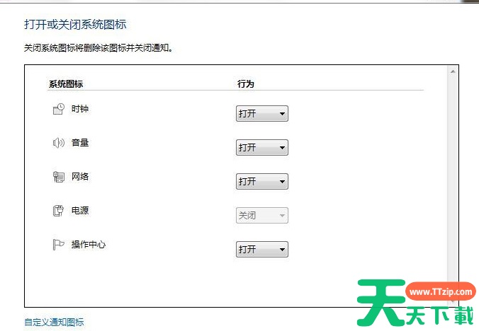 2、找到网络,在行为选择框中选择显示图标和通知,然后确定,也可以点击打开或关闭系统图标打开如下图的界面: