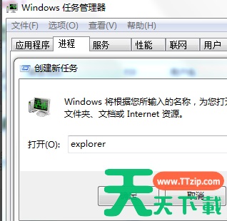 4、向下滚动,找到explorer.exe的进程选择,点击右下角“结束进程”,然后点击右上角文件----》新建任务,在弹出的对话框中输入explorer,确定即可。
