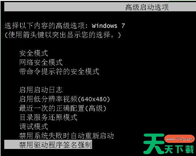 3、在高级启动菜单中选择“禁用驱动程序签名强制”后按回车;