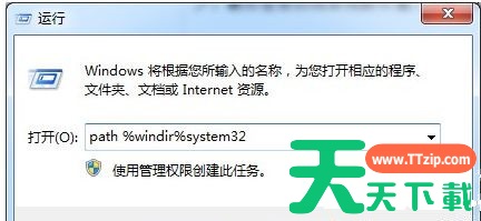 2、在打开的运行对话框中输入“path %windir%system32”字符命令后按确定键;