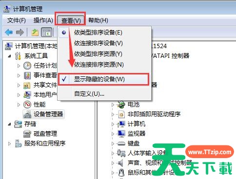 2、在设备管理器窗口,点击菜单栏上的“查看”,选择“显示隐藏的设备”。