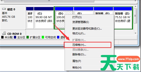 3、之后,右击选择分区,通过菜单选择“压缩卷”调整分区大小。