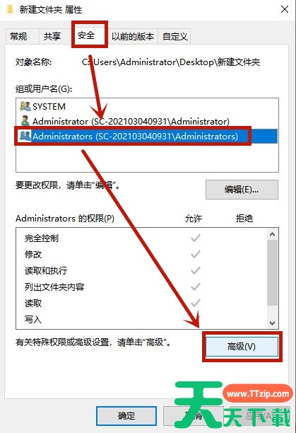 2、在“属性”窗口中单击“安全—Administrators—高级”点击进入。