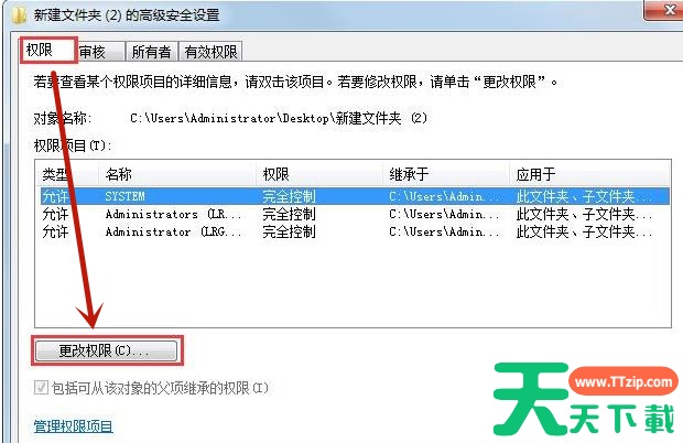 5、在“高级安全设置”窗口中单击“权限”选项卡并点击“更改权限”按钮。