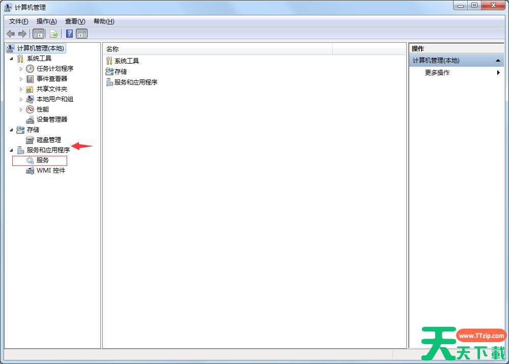 2、然后在管理页面下方点击打开“服务和应用程序”的详细菜单选择其中的“服务”选项。如图所示;