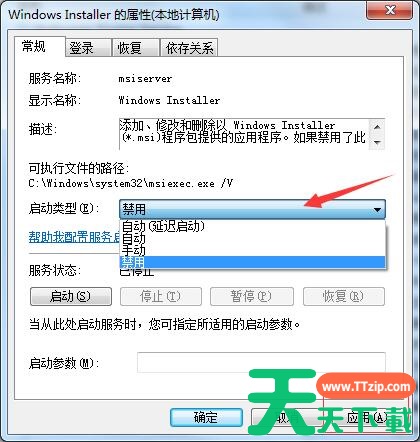 4、最后打开它的属性设置,随后我们点开“启动类型”,选择其中的“禁用”,点击应用即可,如下图所示。