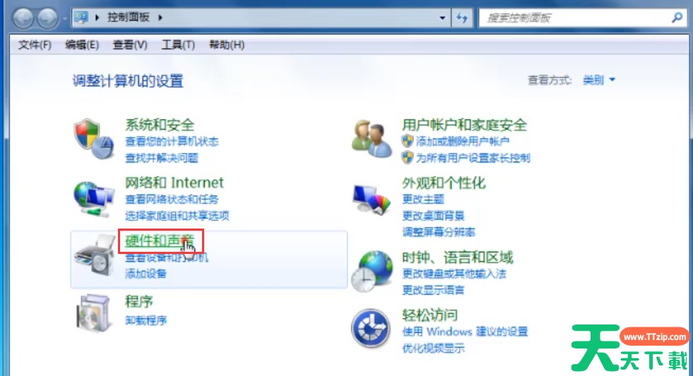5、打开控制面板,选择硬件和声音。
