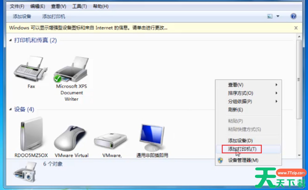 7、右键窗口空白处,选择“添加打印机”即可。