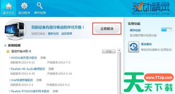 2、检测之后,驱动精灵发现电脑上有4项硬件的驱动有新版本,需要升级,我们点击“立即解决”按钮;