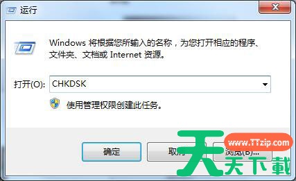 2、在运行输入框里面输入CHKDSK,点击确定。