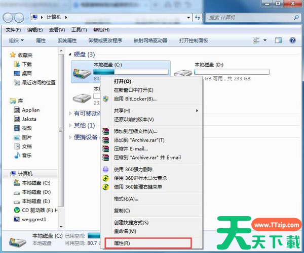 2、右键c盘,选择属性。