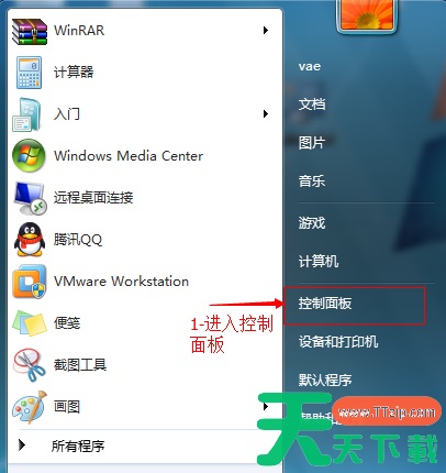1、开始菜单--进入控制面板。