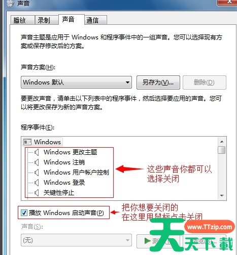 4、把你想要关闭的系统声音用鼠标去掉勾。