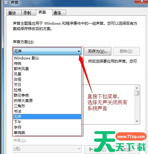 5、【直接关闭Win7所有系统提示音】。