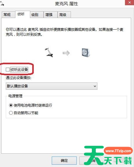 6、在麦克风属性--侦听中,找到侦听次设备,若打钩,请把钩去掉。