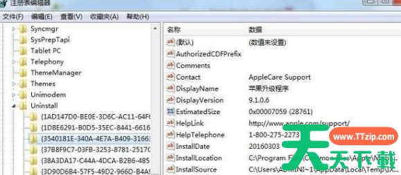 2、打开注册表编辑器后,在左侧展开到“HKEY_LOCAL_MACHINESOFTWAREMicrosoftWindowsCurrentVersionUninstall”,然后可以看到所有安装程序的信息;
