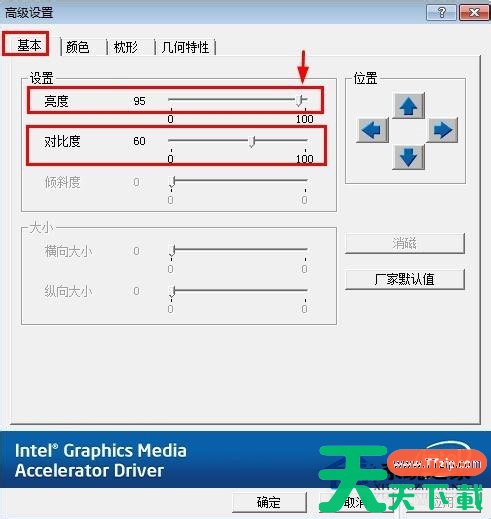 6、高级设置的基本设置中可以拖动亮度或者对比度这里的滑动按钮,调整屏幕的亮度或者对比度,这样操作是非常方便的!调整结束后点击下方确定,并且在调整的时候,可以实时查看电脑显示器的亮度对比度变化!