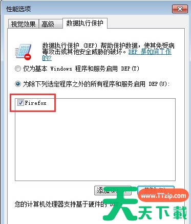 4、然后在性能选项界面中切换到数据执行保护选项,点击选择“为除下列选定之外的所有程序和服务启用 DEP(U):”选项,然后点击“添加”按钮,进入下一步。