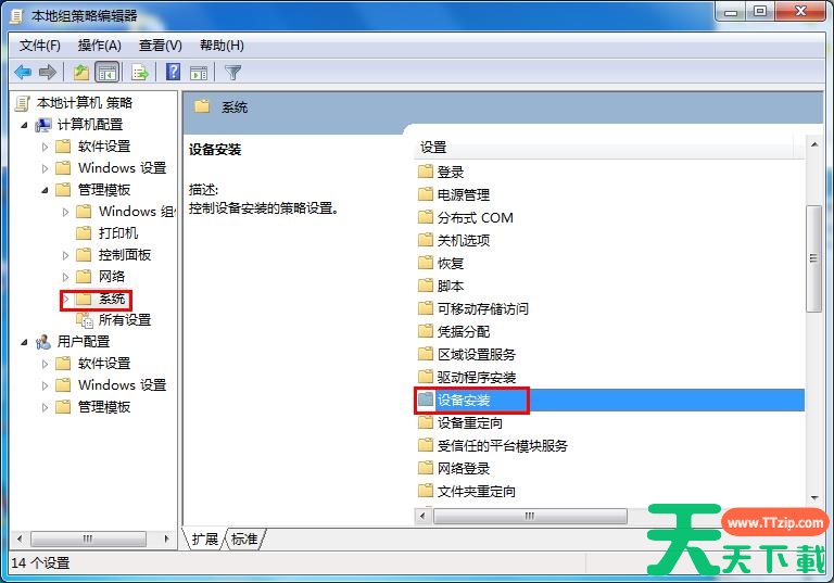 2、在本地组策略编辑器窗口中,依次展开“计算机配置--管理模板--系统”,接着在右边设置列表中双击“设备安装”。