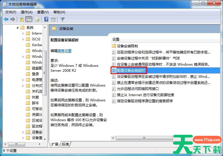 4、单击“已启用选项”,在设备安装超时(以秒为单位)中输入“1800”,确定启用即可。