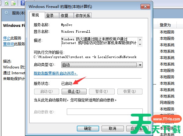 3、在从服务中找到windows firewall此项服务,右键属性,点启动,OK;