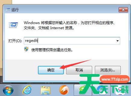 打开设备,调出运行窗口,输入命令“regedit”后,点击“确定”;