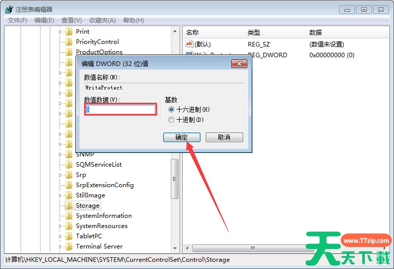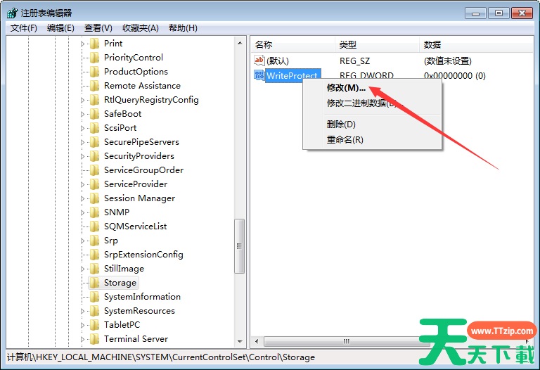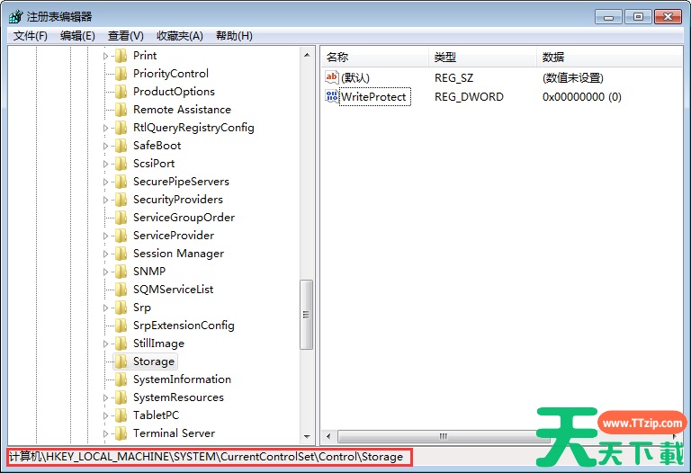 最后,将右侧窗口中名为“WriteProtect”的键值改为“0”即可。