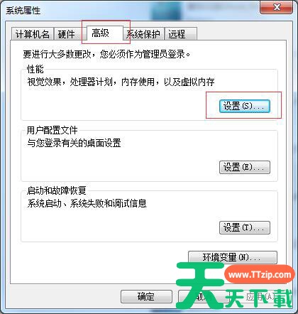 3、接下来在系统属性的窗口中,选中窗口上方的“高级”选项卡,然后点击性能栏目下面的“设置”按钮;