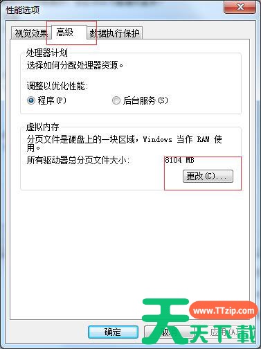 4、在性能选项的窗口上方中选中“高级”选项卡,然后点击下面的“更改”按钮;