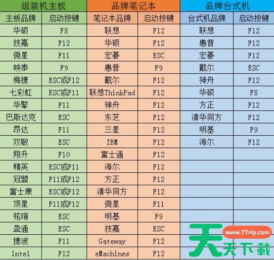 一键进入大番茄PE系统的示例教程,天天下载Ttzip就不详解了,不一样的电脑,一键进入快捷键可能不一样,为此,天天下载Ttzip整理了各种品牌主板一键进入大番茄的快捷键,大家可以在下表中查找对应的品牌主板的启动热键。