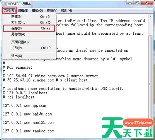 7、我们在文本内容底部输入127.0.0.1空格需要阻止这样的URL如127.0.0.1 http://www.qq.com,如果您需要阻止多个URL,则可以启动另一行:如图所示: