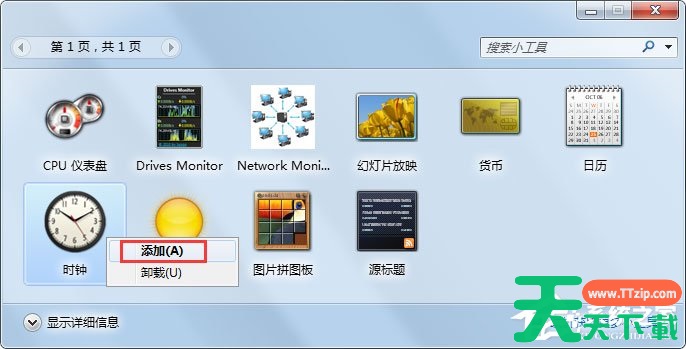 4、在想添加的小工具上单机鼠标右键,会弹出选项,添加或者卸载,选择添加就可以添加这个小工具;
