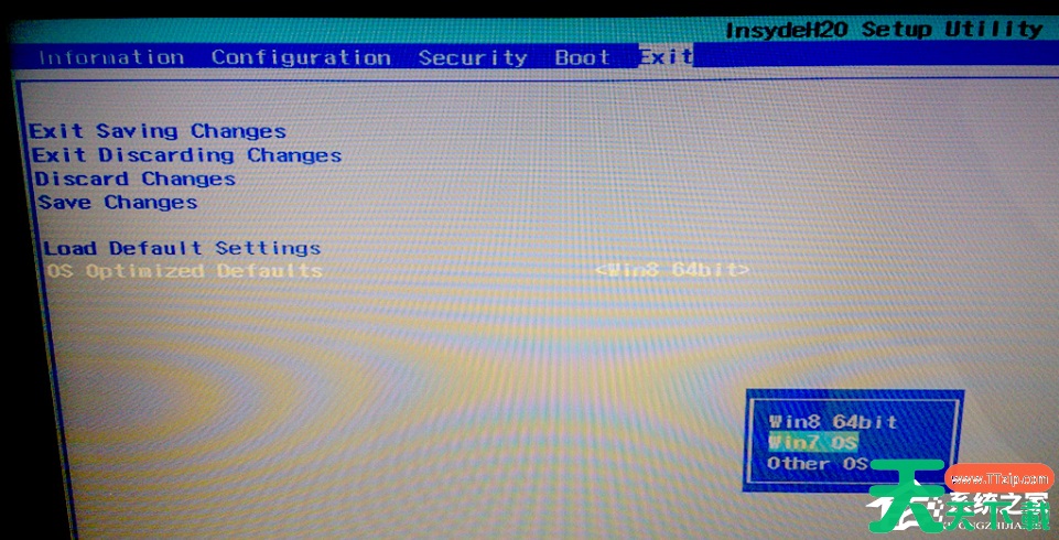 1、重新开机,按Fn+F2(或 F2)进入 BIOS 设置界面。选择Exit选项卡,将其中的 OS Optimized Defaults 改为 Win7 OS。