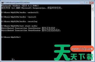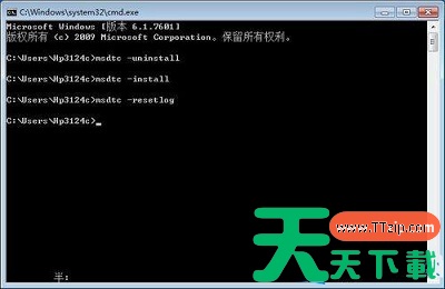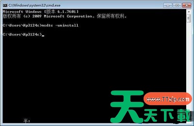 2、在命令行窗口输入:msdtc –uninstall卸载DTC服务。