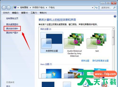 2、打开个人化窗口对话框,找到左侧“更改鼠标指针”如箭头所示位置;