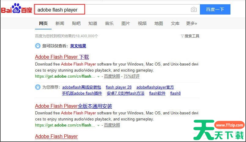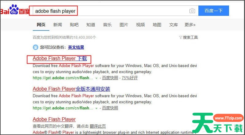 2、在搜索出现的结果中选择Adobe Flash Player下载;当然在本站也能下载。