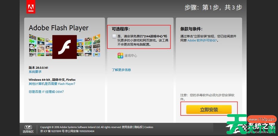 3、打开Adobe Flash Player下载页面,稍等页面加载,把可选程序对号取消,以免安装上了其他游戏软件,点击右下角立即安装,插件安装完成后关闭浏览器重新打开浏览视频页面即可播放。