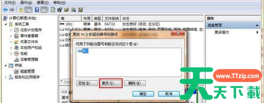 3、然后找到u盘的盘符,右击该u盘,选择“更改驱动器名和路径”在弹出的窗口中点击“更改”按钮;