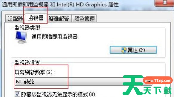 2、在弹出来的界面中切换到“监视器”选项卡,可以看到显示器的刷新频率设置为“60”,这正是造成显示器屏幕不断抖动的原因。将新频率设置为“75”以上,再点击确定返回桌面就可以了。