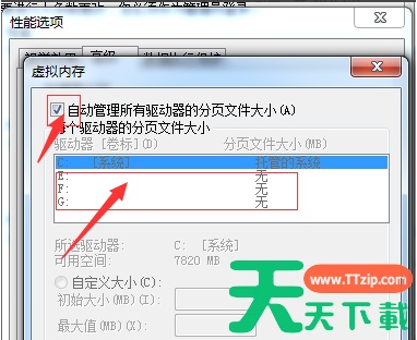 4、可以看到默认是设置在C盘的,要配置先要去掉上面“自动管理所有驱动器的分页文件大小”