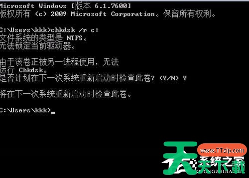 3、无法运行chkdsk,是否计划在下次系统重新启动时检查这个卷?(Y/N),我们输入“Y”,回车。