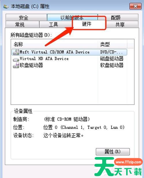 1、左键双击桌面我的电脑,右键点击:C盘-属性 - 硬件;
