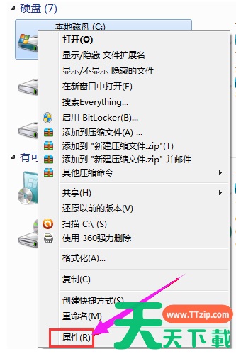 右键C盘,然后在弹出的菜单中选择最下面的属性,进入C盘的属性页。