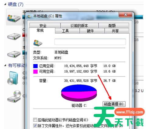 在属性页中,有一个磁盘清理的按钮,即清理这个磁盘的垃圾文件,用鼠标点击这个按钮。