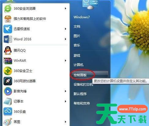 1、首先在Win7系统中打开开始菜单中的控制面板;